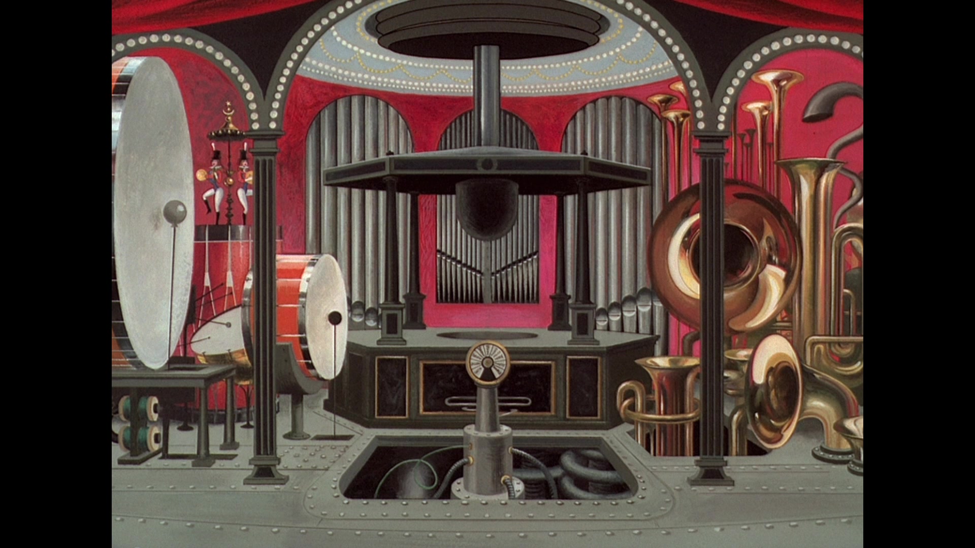 The 1980s version, in addition to removing the sonic references to a busking organ also portrays mechanical organs generally as a neutral technology. The king’s giant robot has quite a lot of space set aside for a fairground organ within it. This organ does play music that could realistically emit from it. It has a large number of tuba-like pipes. These low brass sounds are used to ominous effect and indicate menace.