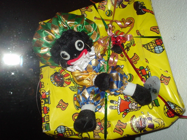 A Zwarte Piet golliwog is attached to a present in a window display in a fancy wedding-cake-type bakery in Den Haag.