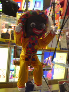 Zwarte Piet hangs from a pole in a toy store by Grote Markt in Den Haag.