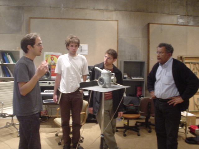 28 September 2004 Aaron explains his watering can to Phillip, Andrew and Anthony Braxton
